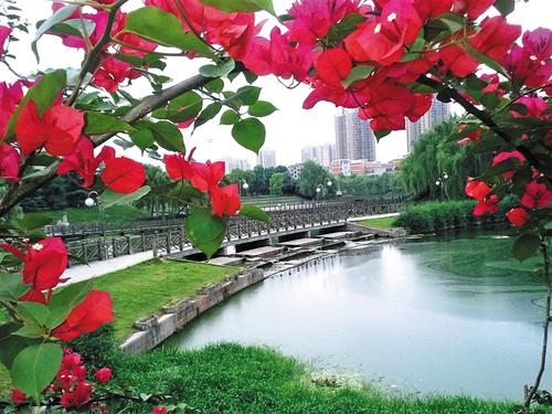 公园广场 游泳池 竹园,音乐喷泉,汗汉白玉大桥。