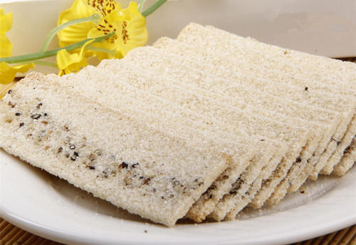 7.成型烘焙:将静置后的糕坯切片成型,糕片长约6厘米,宽2.5厘米,厚2毫米,然后均匀地摆在铁盘或平锅内烘焙,炉温150℃左右,时间约8分钟。糕片呈谷黄色时,即起锅。等冷却后进行包装。